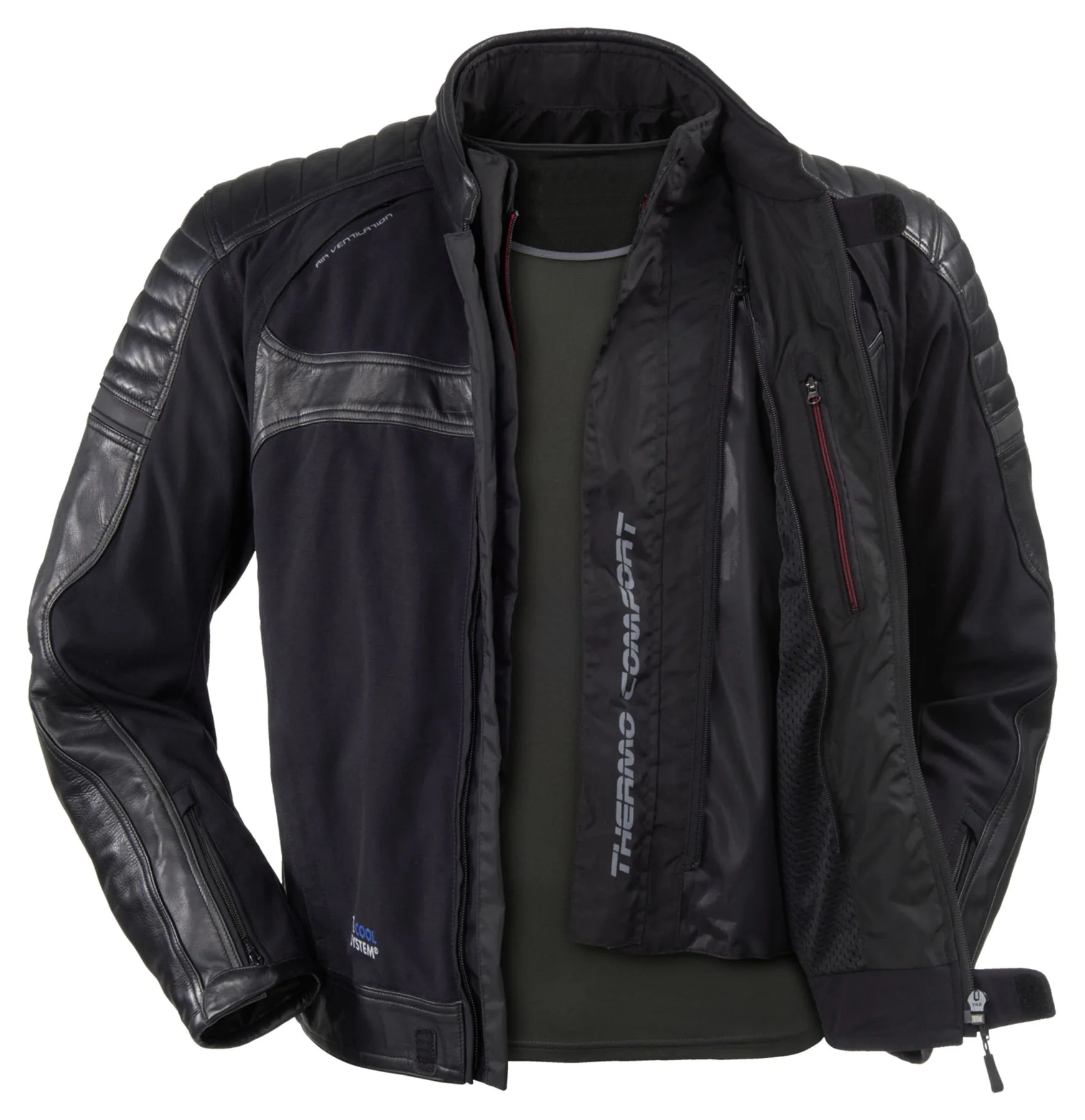 The Büse *Ferno* is a very sporty textile/leather jacket featuring the TFL Cool System to keep it cool in the hot summer sun. In addition, the detachable HUMAX climate membrane makes the Büse *Ferno* ideal for touring, always ensuring that you stay comfortable. Ribbed stretch fabric on the shoulders and elbows keep the jacket close-fitting so that you feel well protected. So now you’re ready to start sweeping through the bends! On a tour, or your favourite biking route – anywhere.