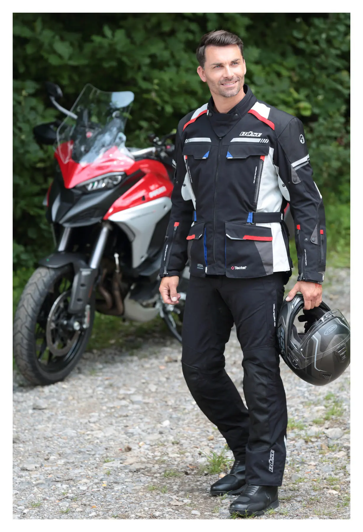 “Highland” is evocative of heroic figures, the Scottish Highlands, wind, weather and, of course, adventure. So it’s exactly the right name for the Büse Highland range. Take the Büse *Highland II*, for example. It’s the slightly re-engineered successor to the Büse *Highland* jacket. Now featuring a climate membrane jacket with thermal liner at the front, ripstop fabric and minor design modifications. Combined with the trousers 211287, the *Highland II* is a fantastic choice for touring, with its numerous pockets. Perfect for touring bikers.