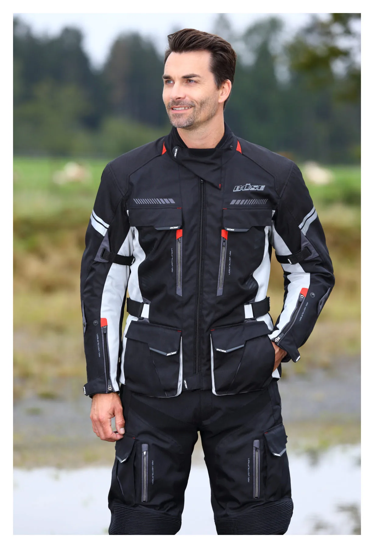 The Büse *Murano* textile jacket is popular with all bikers who like to ride in a versatile, comfortable, textile all-day or touring jacket. So it’s hardly surprising that Büse has now brought out the *Murano III*. It has all the features you really need: Climate membrane, detachable thermal liner, good ventilation, plenty of pockets, comprehensive protective features and abrasion-resistant material. Combine this jacket with *Murano III* Trousers (211605), and you have a great, versatile textile suit.